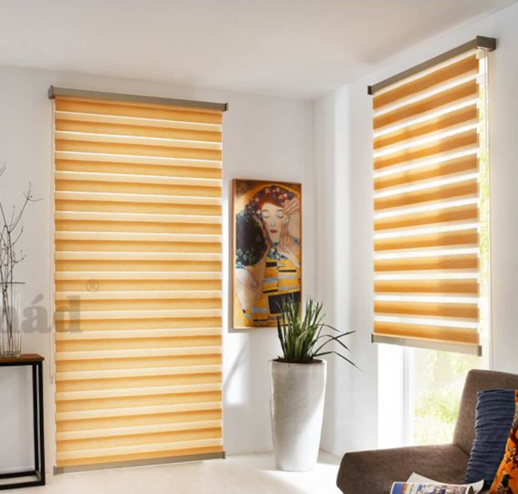 Két áttetsző anyag között futó fényzáró textilsávjai finoman engedik be vagy zárják ki a fényt – így mindig az adott napszakhoz és hangulathoz igazítható a fényviszony.